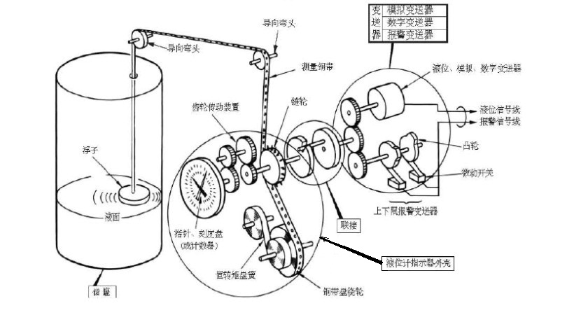 Liquid level meter is designed according to the principle of force balance. A float for W, the weight of the float is immersed in liquid in the buoyancy of F, tensile strength of the steel belt pulling float to T, the friction force of the whole system for F, a position when the float is immersed in liquid, the force equilibrium, namely: W - F - T - F = 0. When liquid level rise, cause float up, strip steel expansion force Zang, less steel strip is flabby, destroy the balance of the whole system source of coil spring torque reduction, so the corresponding coil spring winding, wrap has relaxation of steel strip on the steel belt wheel, the steel strip, the whole system to balance.